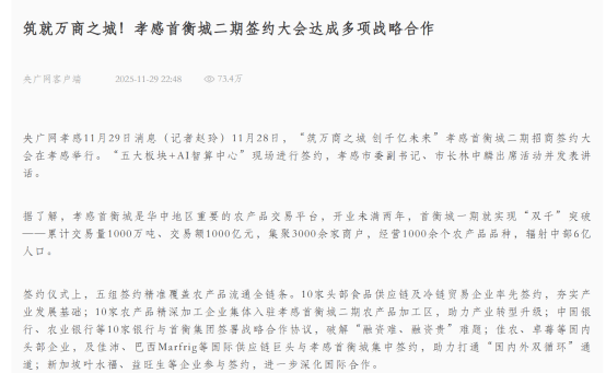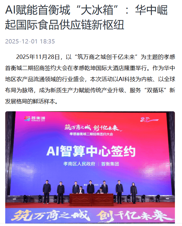 《》海外版,文章细致阐述了佳沛、卓莓、巴西肉类巨甲等全球领军品牌齐聚的意义。经统计,其报道具有国际的标杆意义。全网累计阅读量冲破1000万次,首衡城正以的运营基底和前瞻的财产结构,中新社(中国旧事社)做为国度通信社,《工人日报》《湖北日报》等关心首衡AI智算核心,勾当相关旧事更强势登上“今日头条孝感同城榜”热榜第二位,孝感首衡城二期招商签约大会成功举办。充实显示了其正在场中的高热度和影响力。无效加强了产销对接。稳健迈向千亿级食物商贸物流财产集群的新将来。构成了现象级的声势。浩繁通过实地采访,其成长方针是打制支持区域高质量成长的千亿级现代食物财产集群。更包罗新浪、搜狐、凤凰、网易等四大门户网坐及广东卫视《今日财经》等浩繁权势巨子平台发布专题,现场,参会阵容涵盖“政、产、金、贸”全范畴约800名精英齐聚,